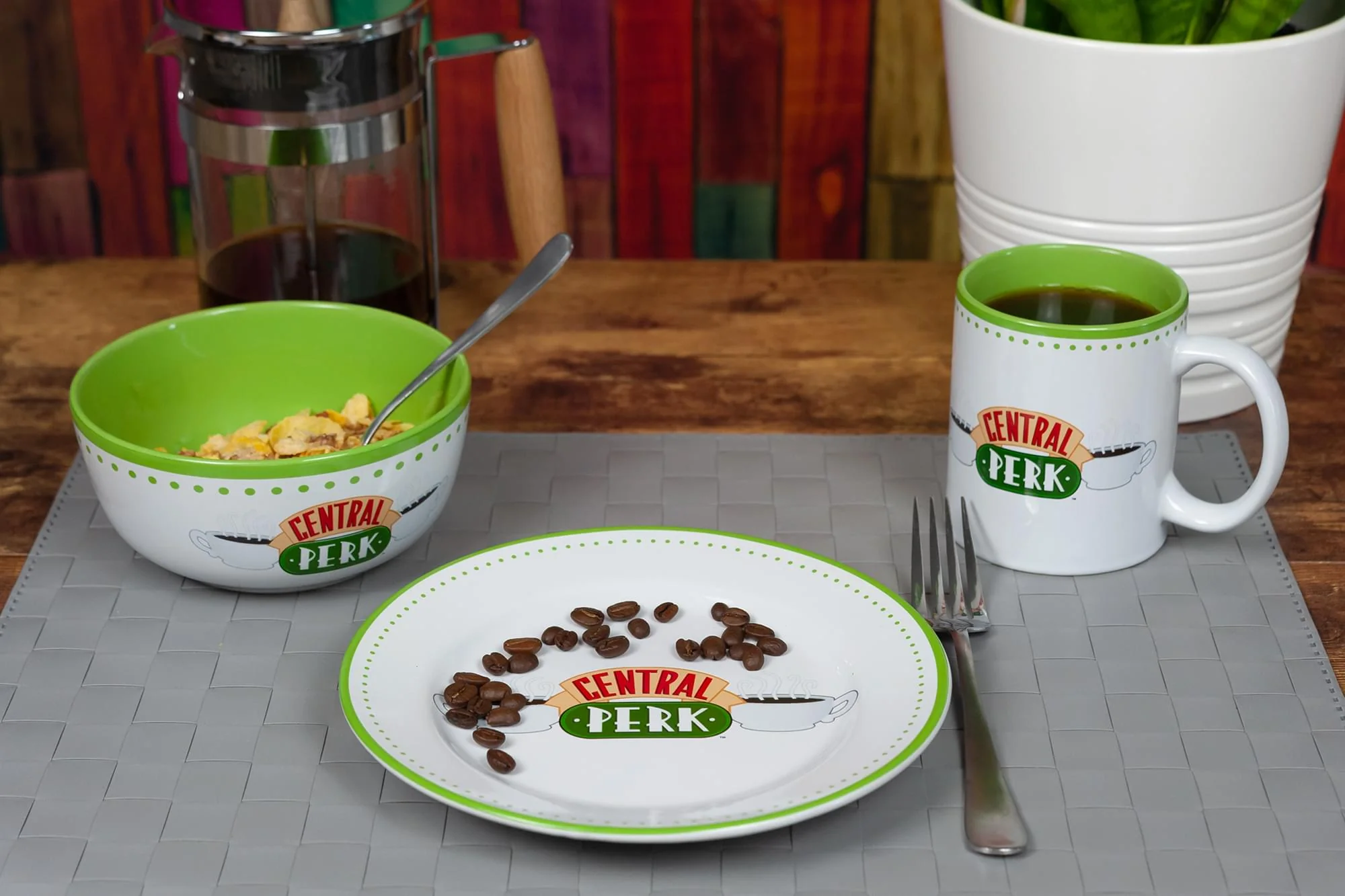 Time and time again, we see our favorite group of friends gathered around their reserved table at the iconic Central Perk coffeehouse in New York City. Chandler, Monica, Rachel, Ross, Joey, and Phoebe have all given us countless laughs while seated at their go-to hangout spot. This dining set from Central Perk serves as a reminder for all the laughs shared. Featuring a dinner plate, dinner bowl, and coffee mug each adorned with the Central Perk logo, this 3-piece dinner set is perfect for anyone looking to celebrate their favorite series over dinner. Make Chef Monica proud and compliment your favorite meals with this Central Perk dinnerware.